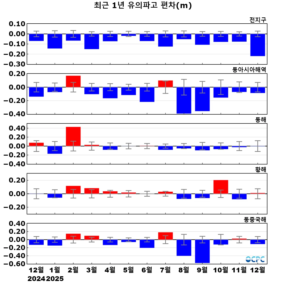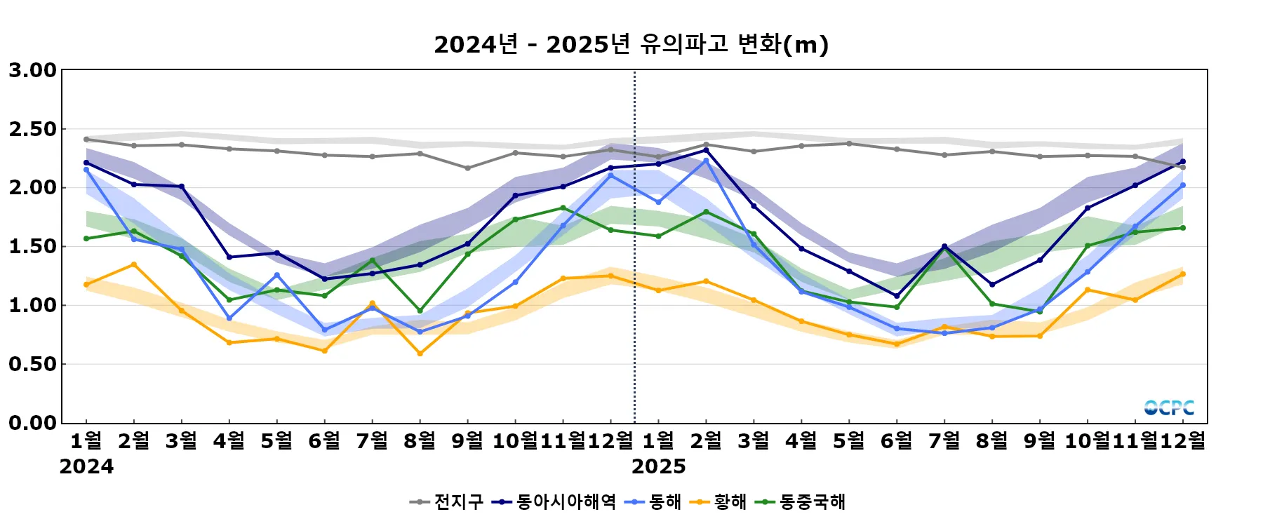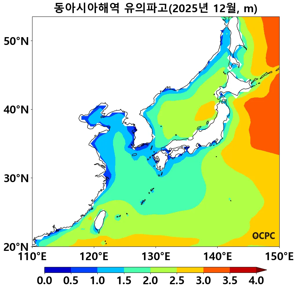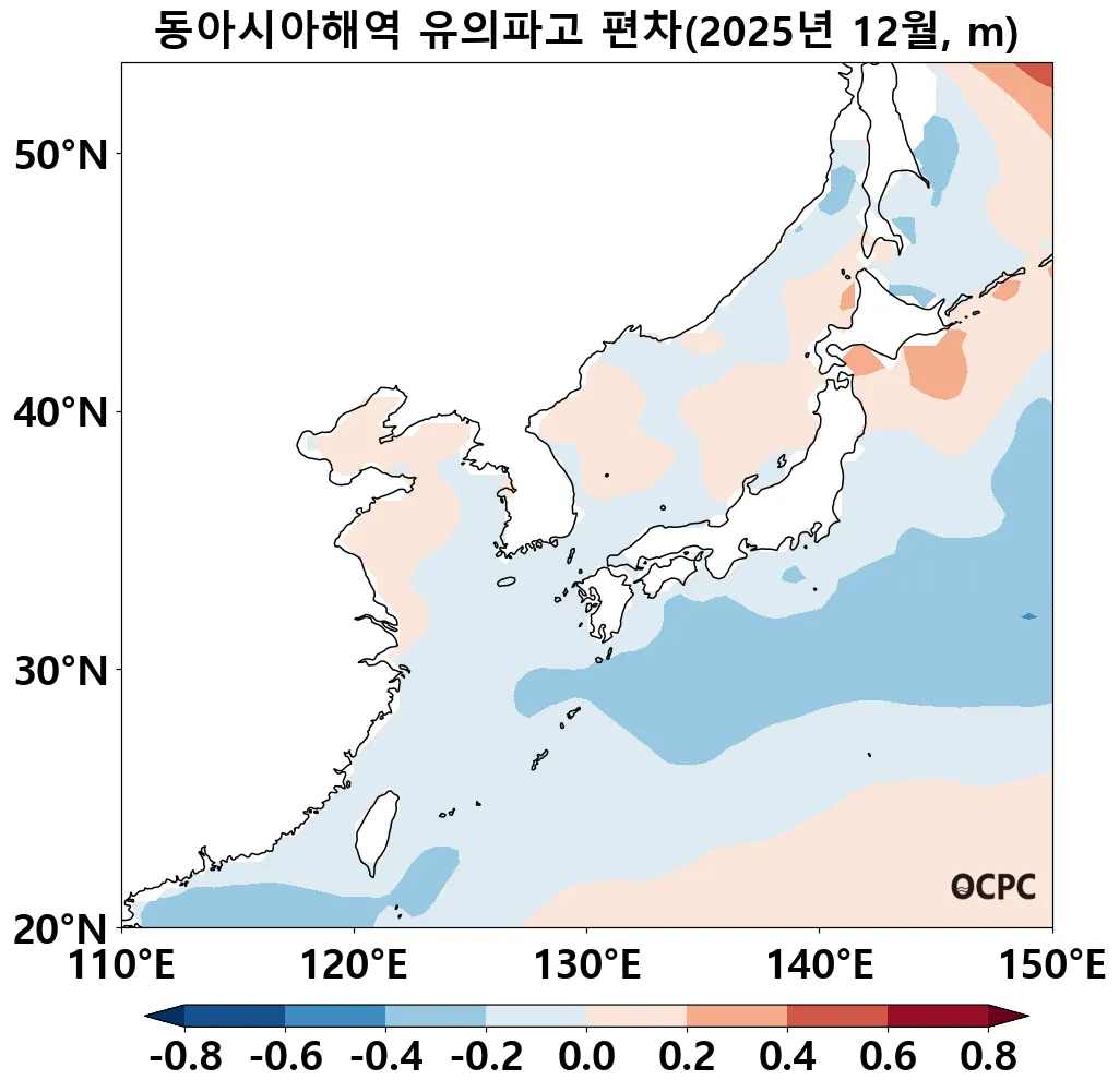 동아시아해역의 평균 유의파고는 평년(2.31±0.07m)보다 0.09m 감소했습니다.