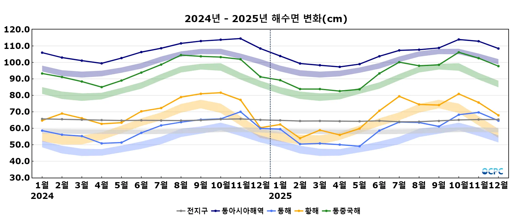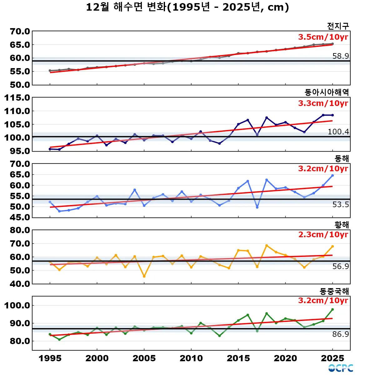 1995~2025년 동안 전지구 평균 12월 해수면은 10년에 3.5cm씩, 동아시아해역은 2.3~3.3cm씩 상승하는 추세입니다.