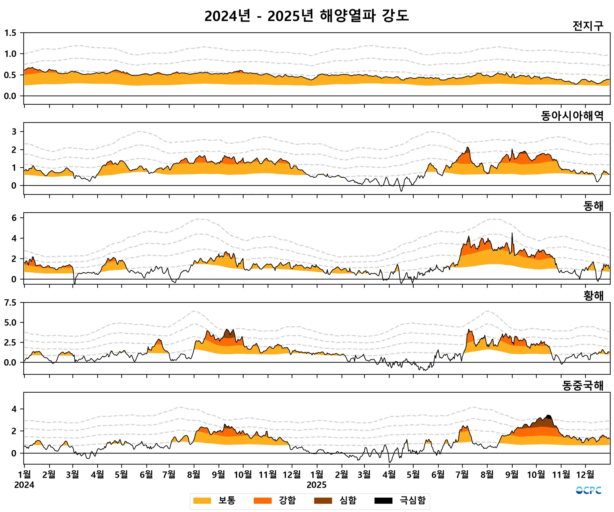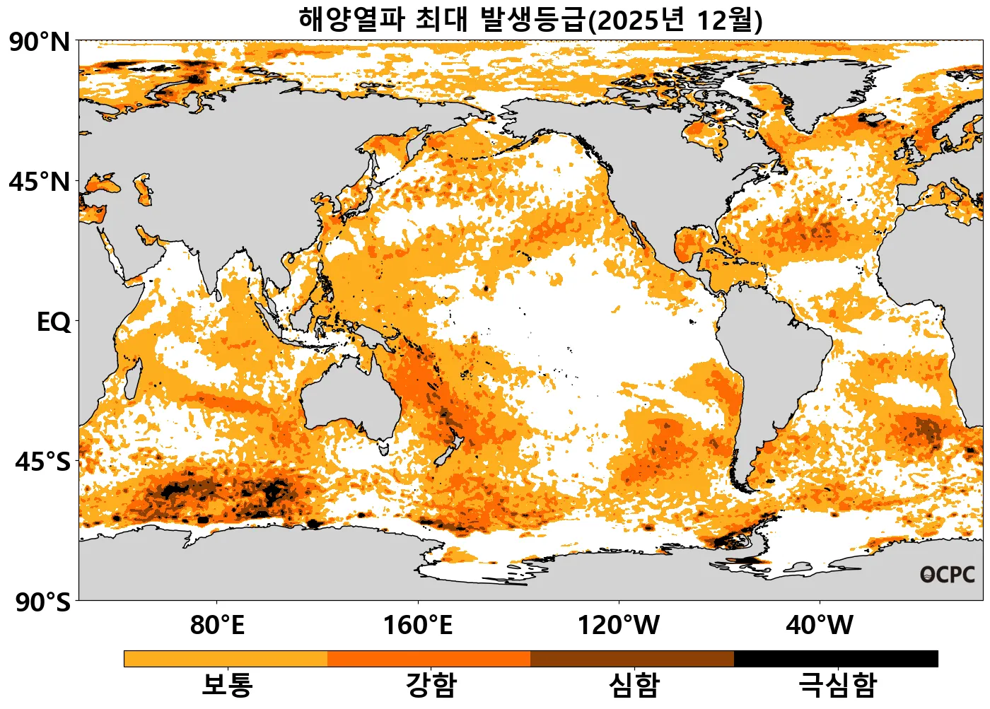 전지구 해양열파는 2023년 1월에 발생하여 현재까지 ‘보통’~’강함’ 등급을 유지하고 있습니다.