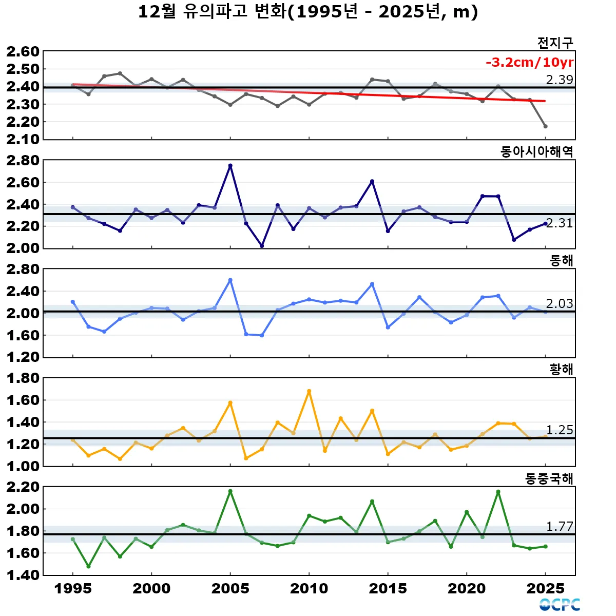 1995~2025년 동안 전지구 12월 유의파고는 10년에 3.2cm씩 감소하는 추세입니다.