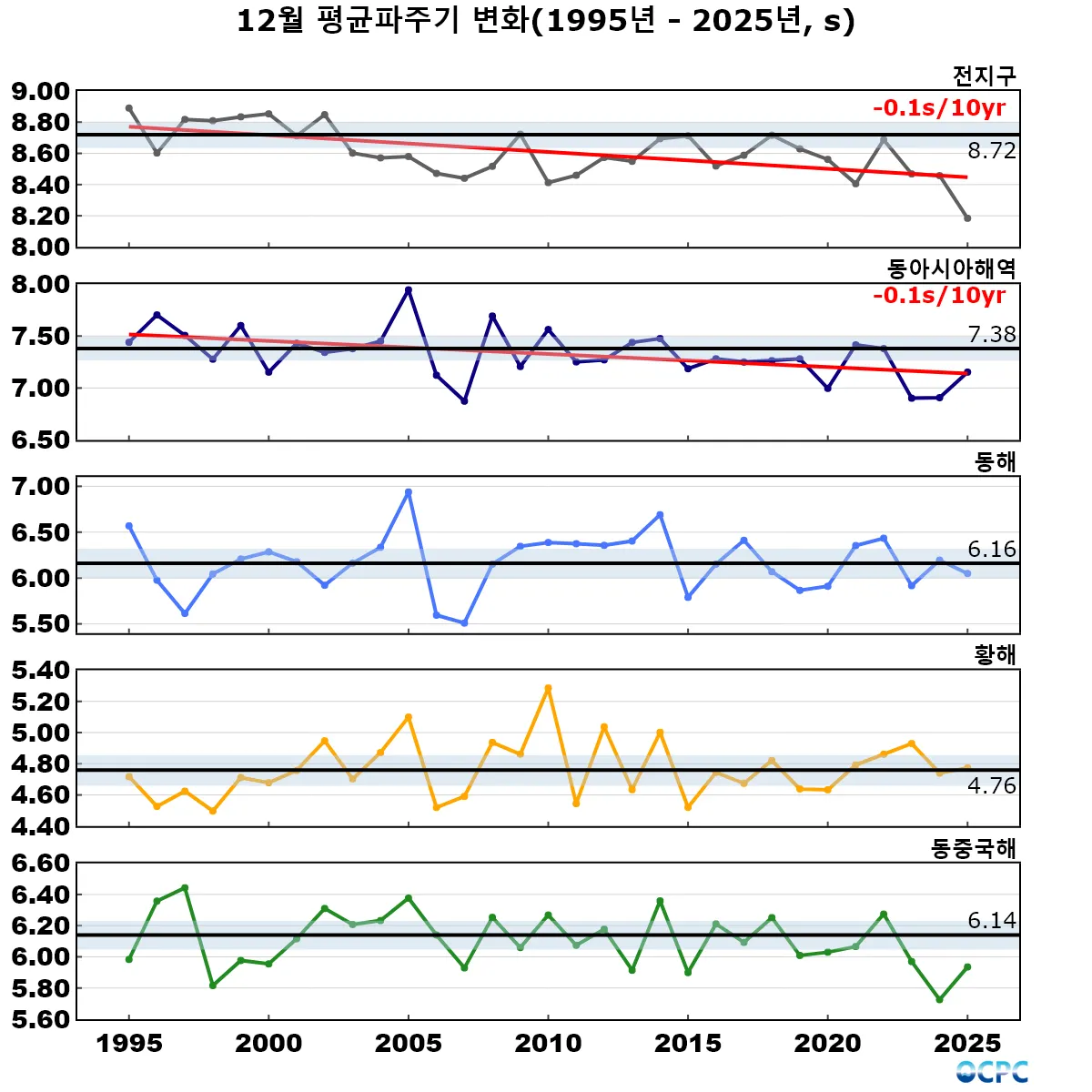 1995~2025년 동안 전지구, 동아시아해역의 12월 평균파주기는 10년에 0.1초씩 짧아지는 추세입니다.