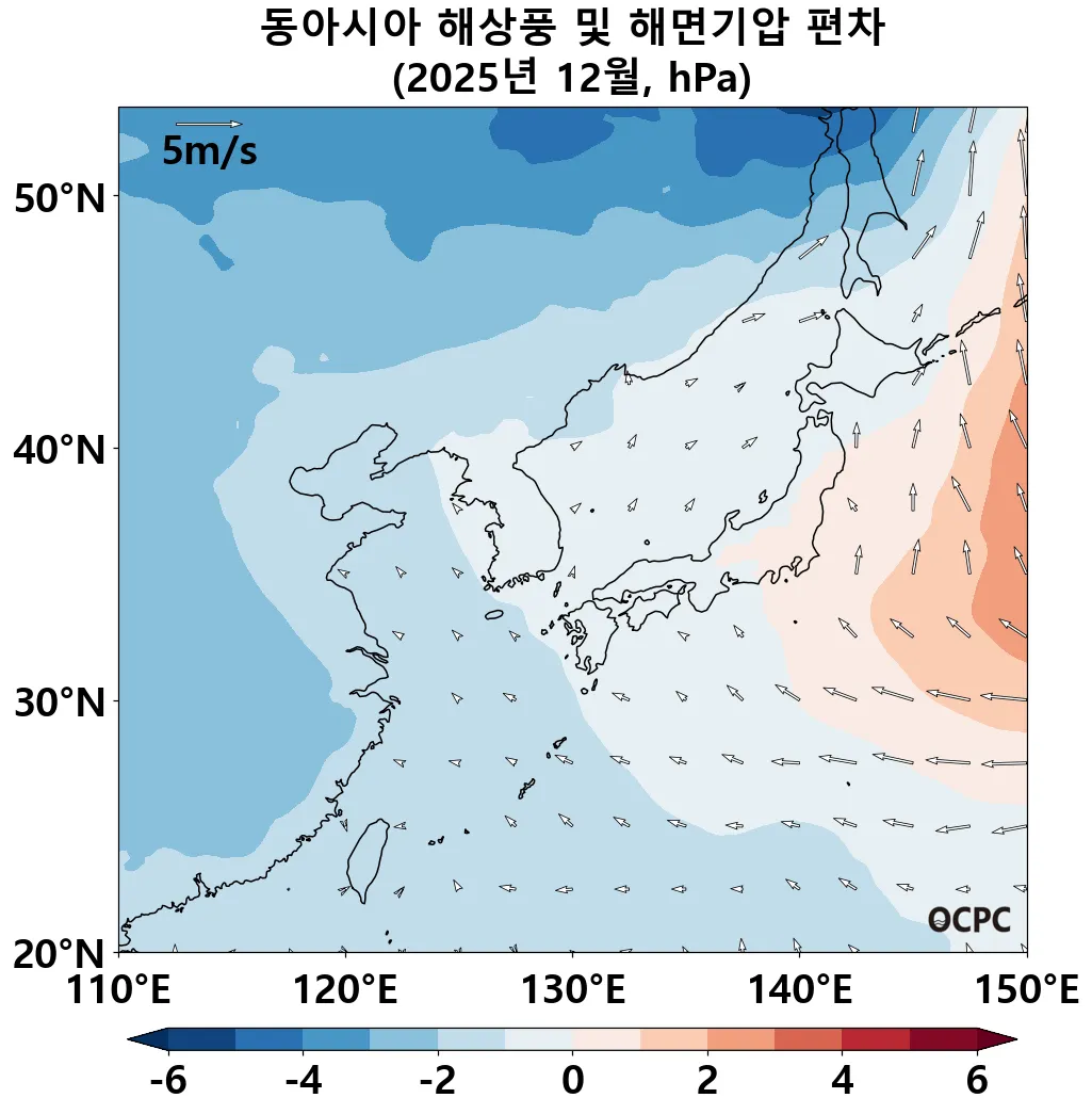 북극의 태평양 해역에서 저기압성 편차, 북태평양에서 고기압성 편차가 나타났으며, 이러한 분포는 동아시아 해역의 온화한 기온에 영향을 주었습니다.