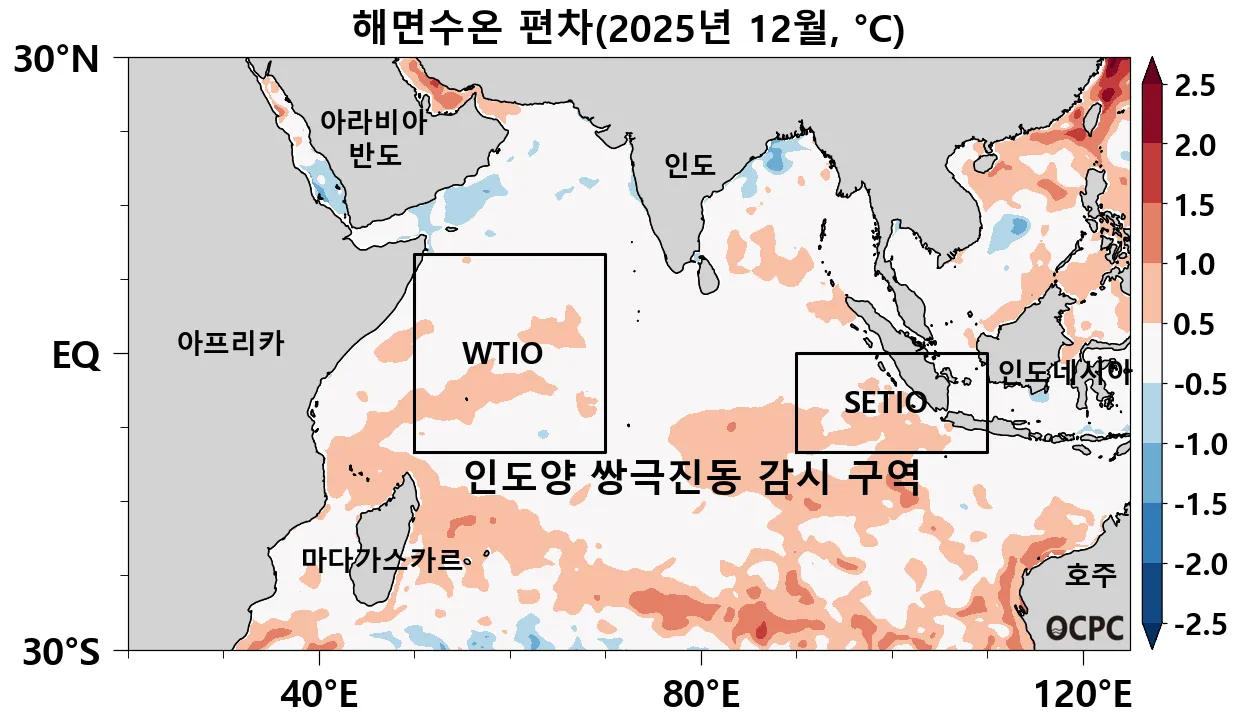12월 평균 해면수온 편차로 산출한 인도양 쌍극진동 지수는 중립 상태(-0.1°C)입니다.