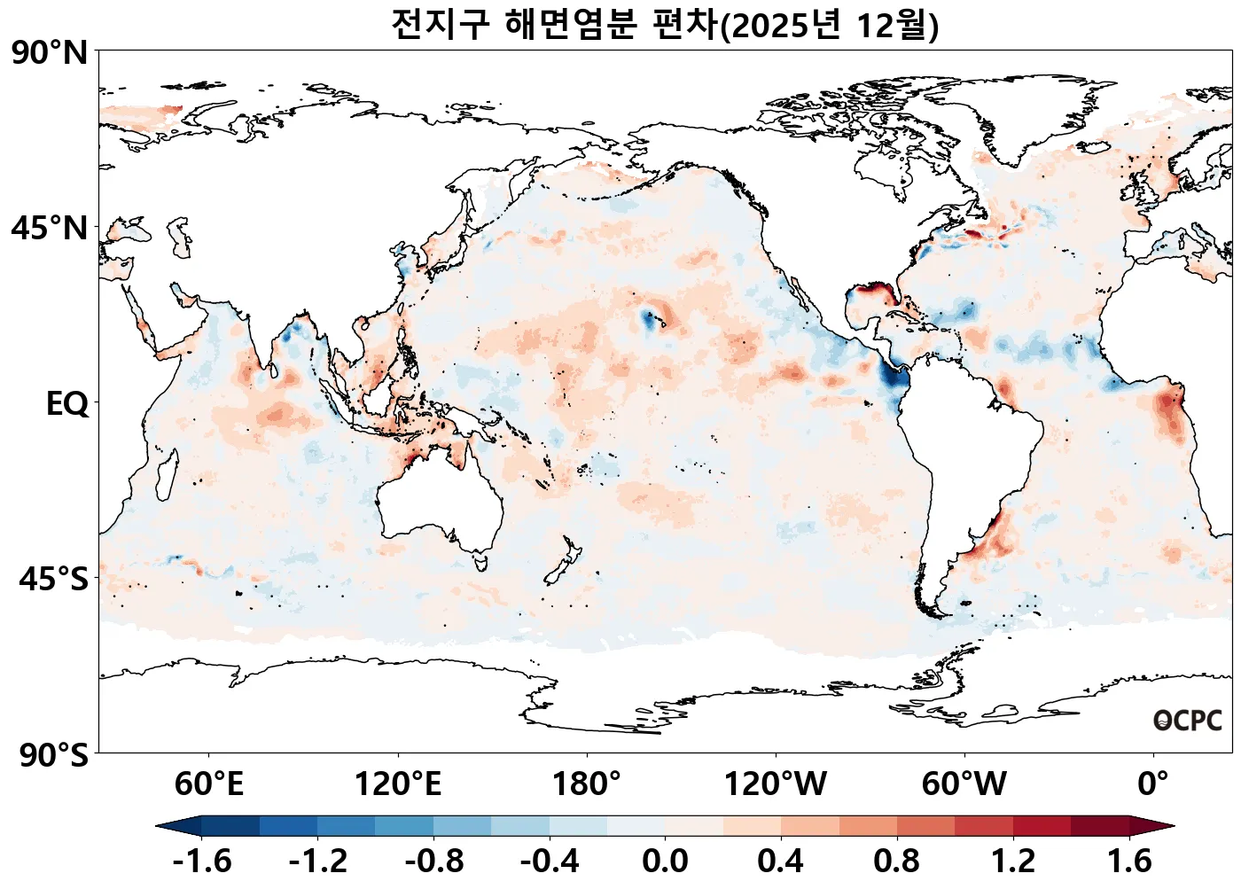 2025년 1월부터 원활한 자료 제공을 위하여 EU Copernicus Marine Service Information에서 제공하는 해면염분 자료로 변경되었습니다. 해면염분의 인공위성 자료는 2016년 이후로 신뢰할 수 있다고 판단하여 2016년부터 2024년까지 9년의 자료기간을 설정 후 기간 평균 대비 월별 편차를 시범적으로 제공합니다.