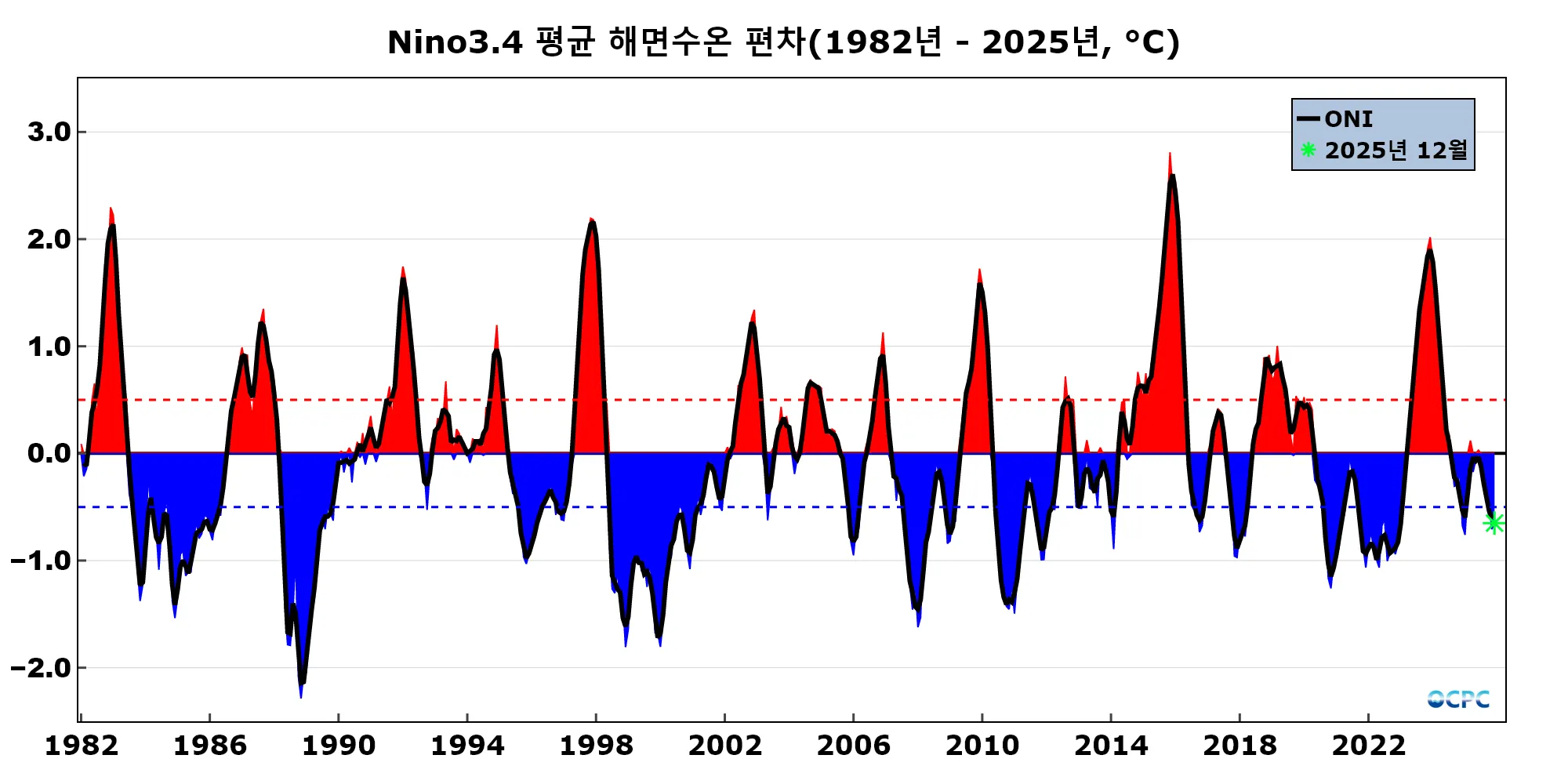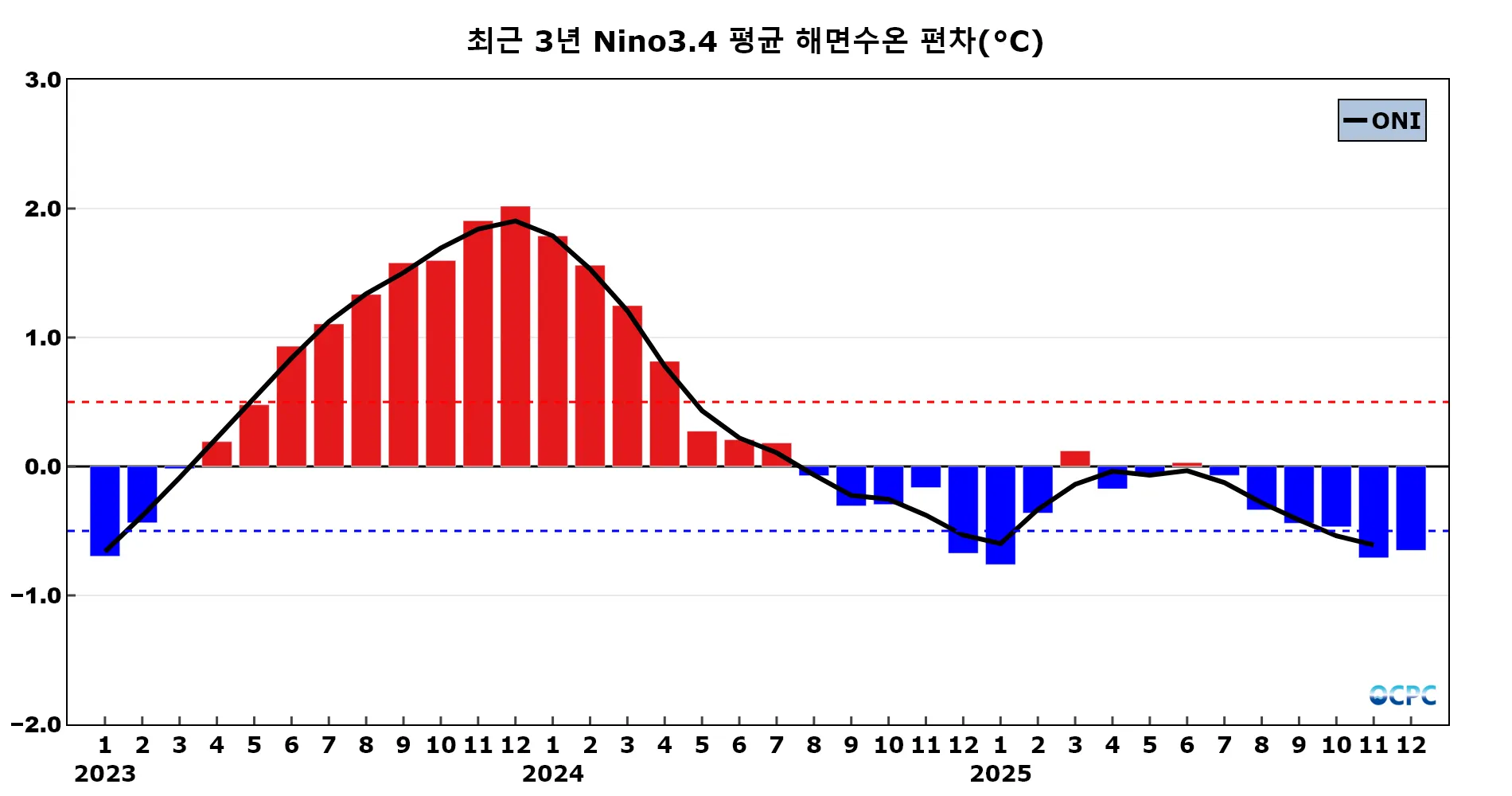 ONI(Oceanic Niño Index): 엘니뇨/라니냐 감시구역인 Nino3.4 해역의 월평균 해면수온 편차(채색부분)를 3개월 이동평균하여 나타낸 지수(검정선)로 0.5보다 크면 엘니뇨, -0.5보다 작으면 라니냐로 판정합니다. OCPC 월간 분석정보에서는 당월 평균 지수를 기준으로 잠정적으로 엘니뇨 또는 라니냐로 판정합니다.