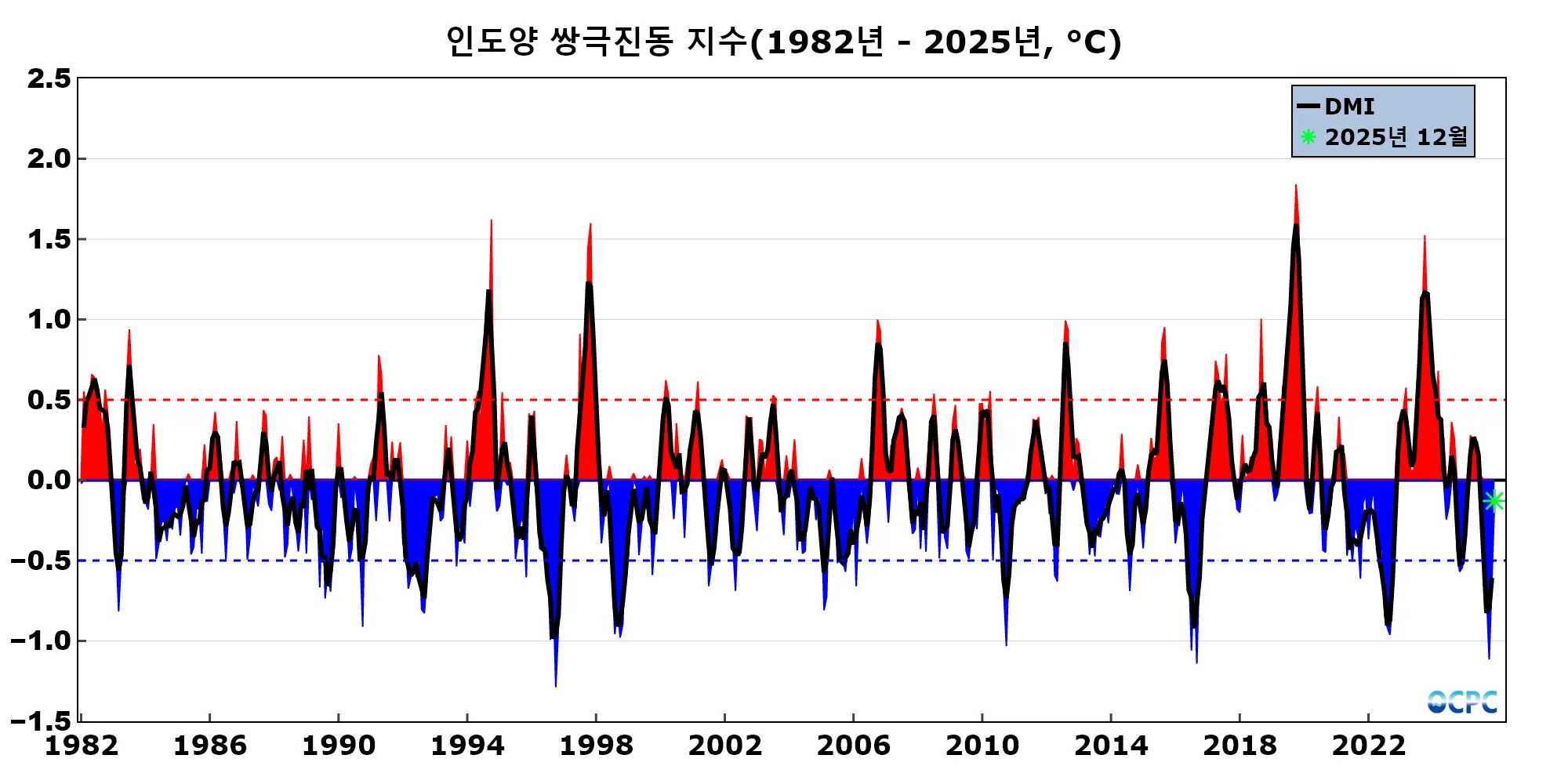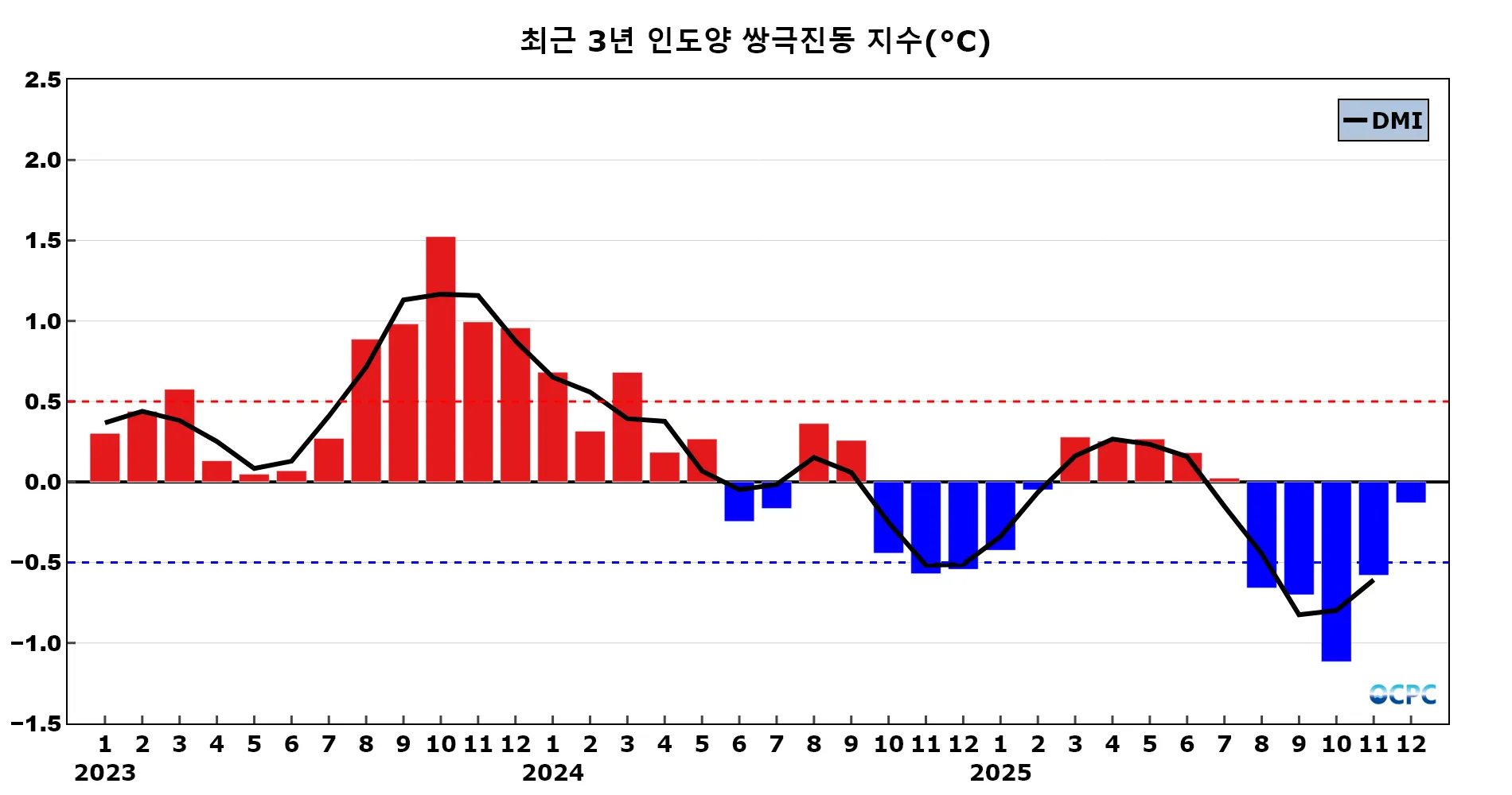 인도양 쌍극진동 지수 DMI (Dipole Mode Index)는 WTIO의 평년 대비 편차에서 SETIO의 평년 대비 편차를 뺀 값으로 월 평균 지수(채색부분)를 3개월 이동평균하여 나타낸 지수(검정선)가 0.5보다 크면 양의 상태로, -0.5보다 작으면 음의 상태로 판정합니다. OCPC 월간 분석정보에서는 당월 평균 지수만을 이용해서 잠정적으로 판정합니다.