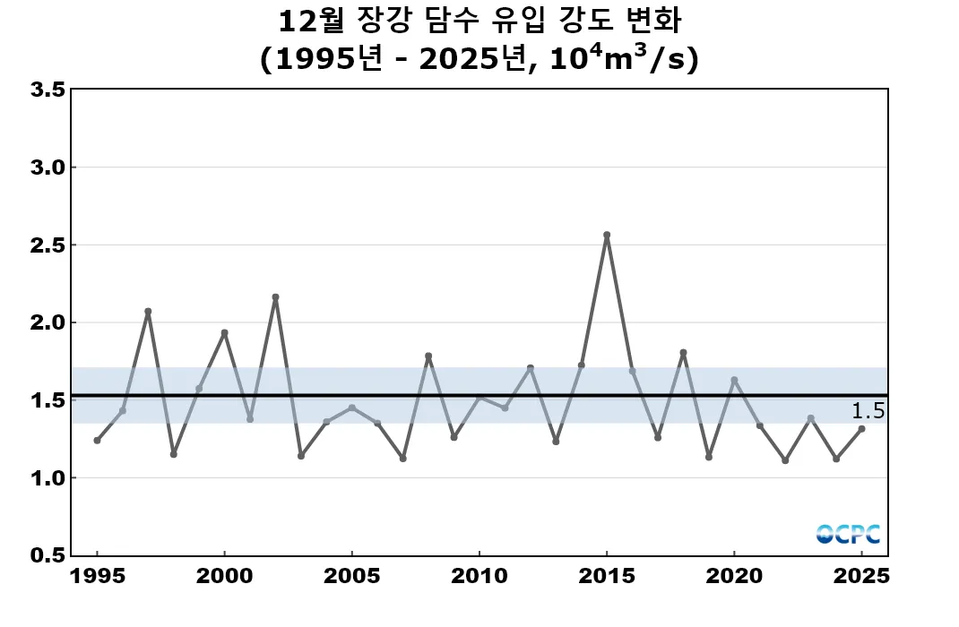 장강 담수 유입 강도는 초당 13,149톤으로 평년(초당 15,305±1,836톤) 보다 약 2,156톤 (약 14.1%) 감소했습니다.