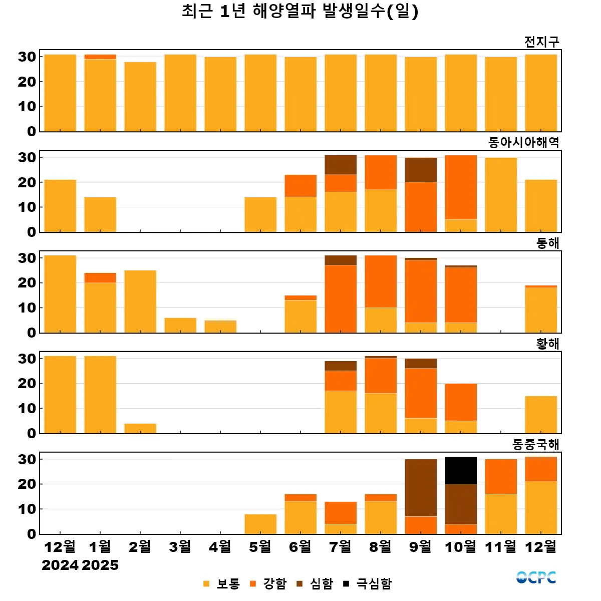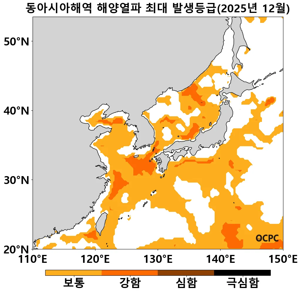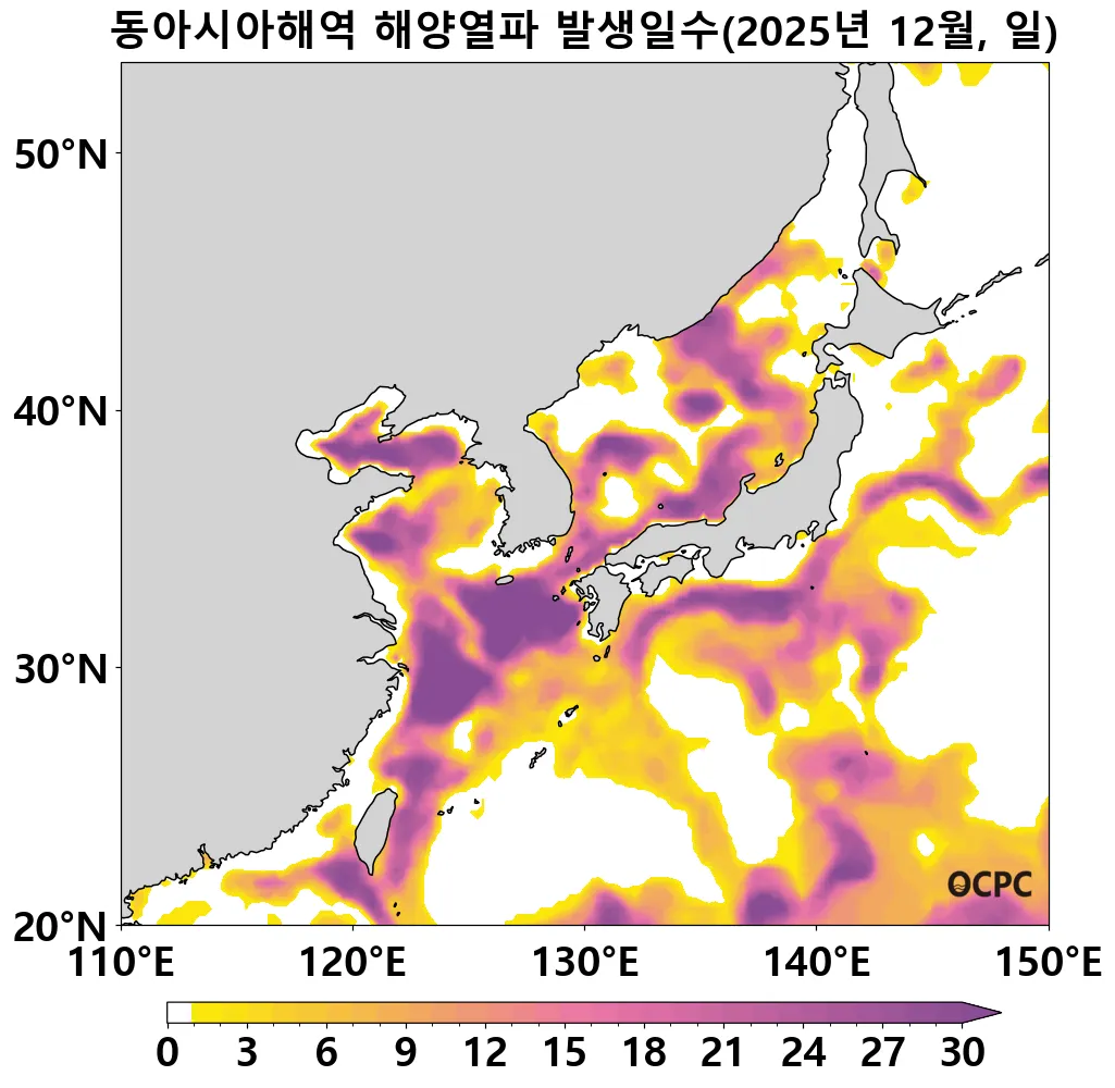 동중국해에서는 8월 16일부터 12월 31일까지 총 138일간 해양열파가 지속되었고, 10월에는 최대 ‘극심함’ 등급의 해양열파가, 12월에는 최대 ‘강함’ 등급의 해양열파가 발생하였습니다.