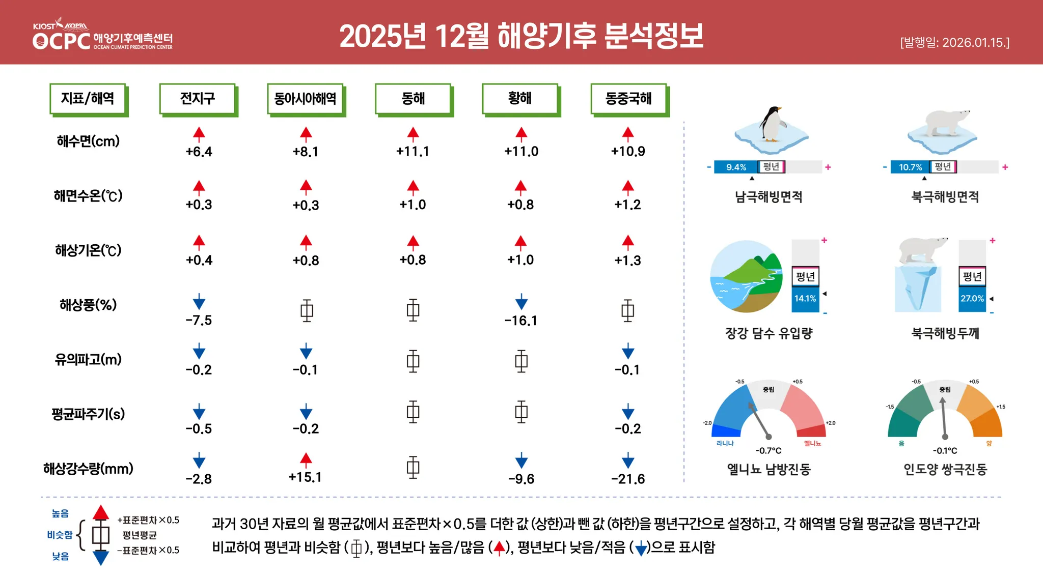 [전지구 해역] 해수면(+6.4cm, 상위 1위), 해면수온(+0.3℃), 해상기온(+0.4℃, 상위 3위)은 평년보다 높았습니다. 해상풍속(-0.4m/s, 하위 2위), 유의파고(-0.2m, 하위 1위), 평균파주기(-0.5s, 하위 1위), 해상강수량(-2.8mm)은 평년보다 낮았습니다. 엘니뇨/라니냐 지수는 라니냐 상태이며, 인도양 쌍극진동 지수는 중립 상태입니다.