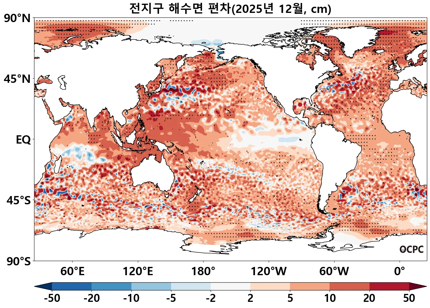 북극해, 남극해 및 북태평양에서 2 표준편차를 초과하는 해수면 편차가 나타났습니다.