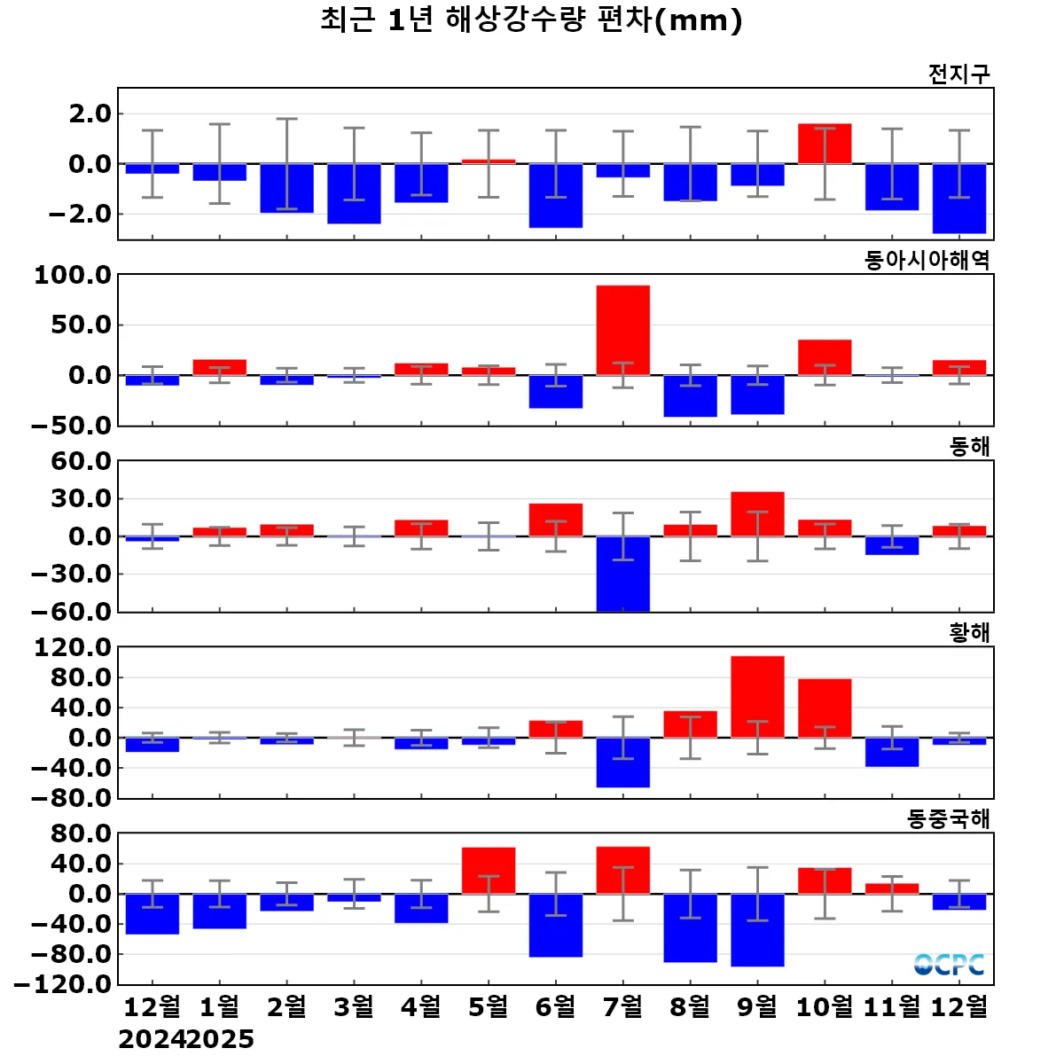 동아시아해역의 누적 해상강수량은 평년(109.1±8.6 mm)보다 15.1 mm 많았습니다.