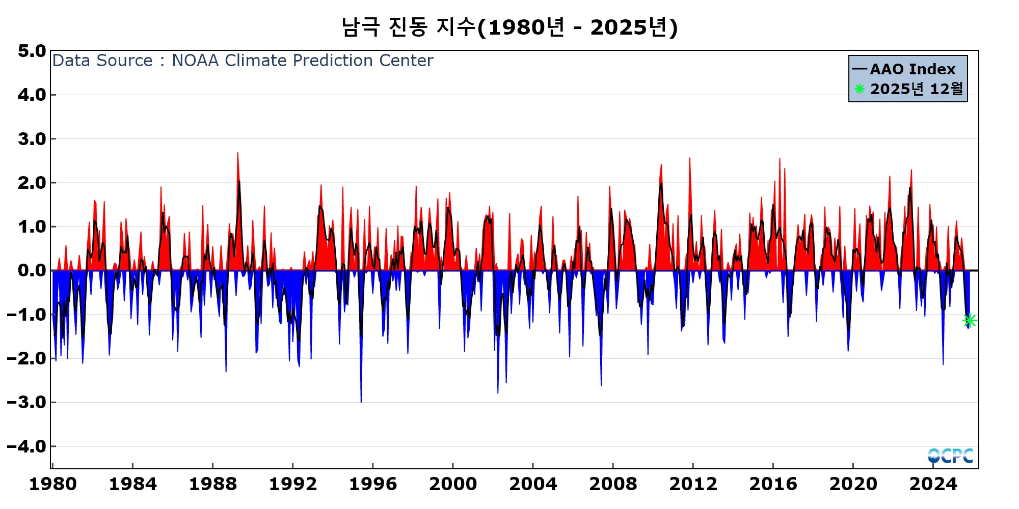 남극진동지수는 미국기후예측센터(CPC, Climate Prediction Center)에서 제공하는 월 평균 자료(채색부분)와 이를 3개월 이동평균하여 나타낸 지수(검정선)입니다. OCPC 월간 분석정보에서는 당월 평균 지수만을 이용해서 잠정적으로 판정합니다.